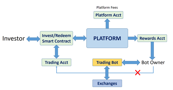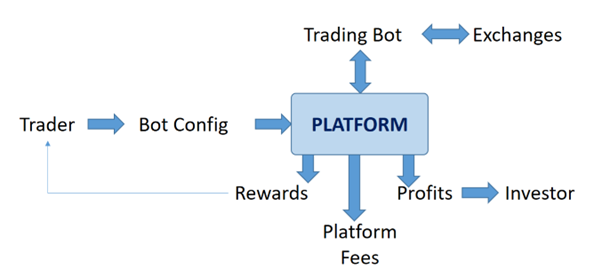 These platforms enable skilled traders with well-defined, backtested and automated strategies to reach the investors looking for better profits and vice versa. For the traders who put up their bots, the platform gives them the ability to access trading capital, while providing investors with more profitable options that are not available elsewhere. The typical structure of these platforms is shown below.